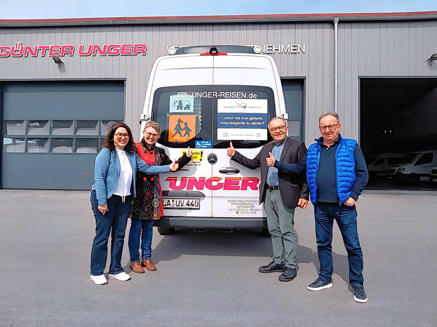 Jeder kennt sie, die kleinen Busse der Firma Unger, die morgens, mittags und abends durch Stadt und Landkreis fahren, um Schüler und Mitarbeiter zu befördern. Allein durch ihre Menge werden sie sehr stark wahrgenommen. Diese Auffälligkeit brachte Barbara Frey, Öffentlichkeitsbeauftragte im Hospizverein Landshut e.V., auf die Idee, bei Herrn Unger wegen Bus-Werbeflächen anzufragen. Die Präsenz der Busse ist ideal, um darauf aufmerksam zu machen, dass der Hospizverein Landshut e.V. in diesem Jahr das 30-jährige Bestehen feiert. Unterschiedliche Aktionen sollen auf die Kernaufgabe des Hospizvereins, die Begleitung von schwerstkranken, sterbenden und trauernden Menschen, aufmerksam machen. Auf die Idee angesprochen, war auch Firmeninhaber Günter Unger sofort mit von der Partie und stellte einen Teil seiner Fahrzeuge zur Beklebung zur Verfügung. Beim Fototermin brachte Günter Unger seine Bereitschaft so auf den Punkt: „Gerne stelle ich die Werbeflächen zur Verfügung, um eure Arbeit und die eurer vielen Ehrenamtlichen zu unterstützen.“